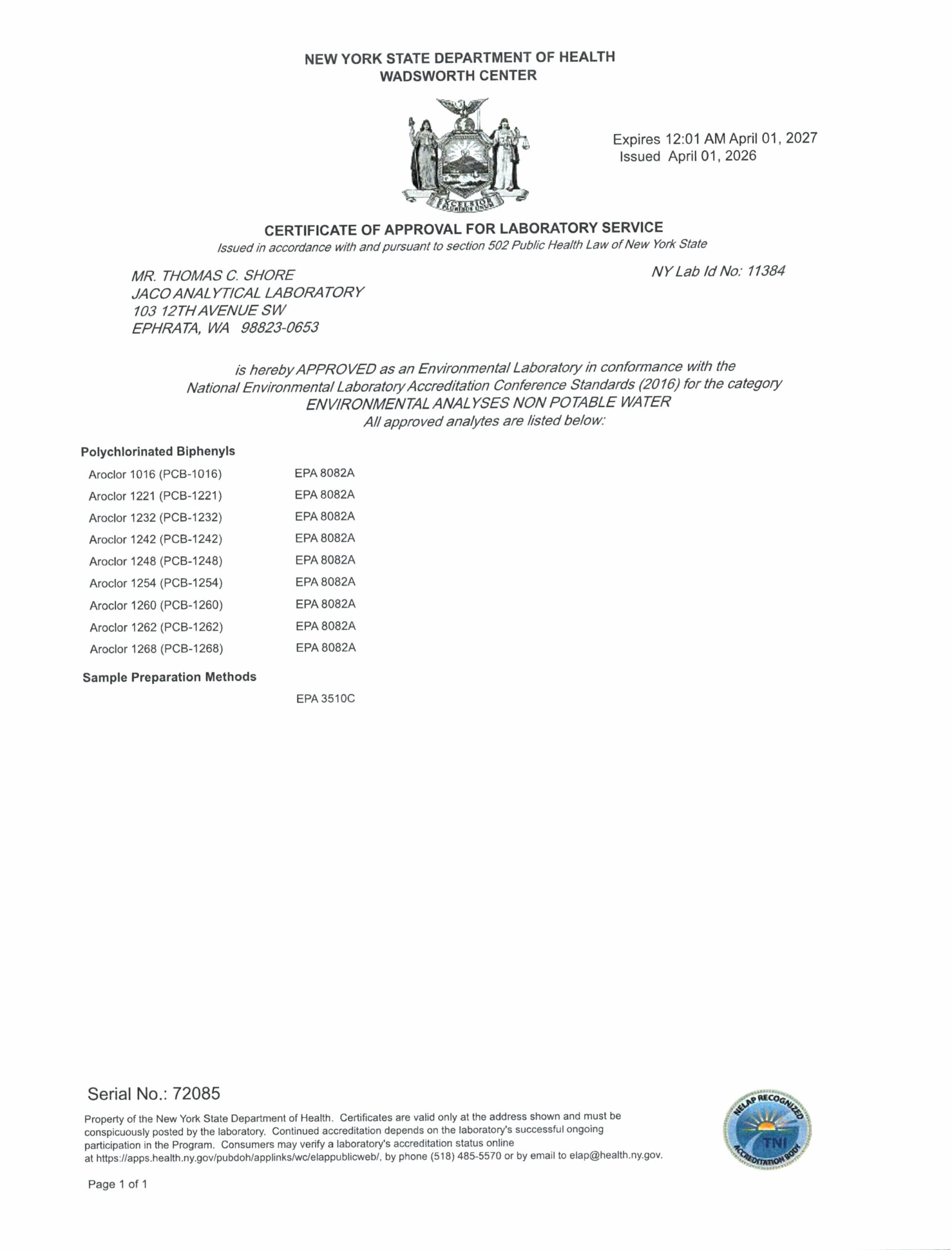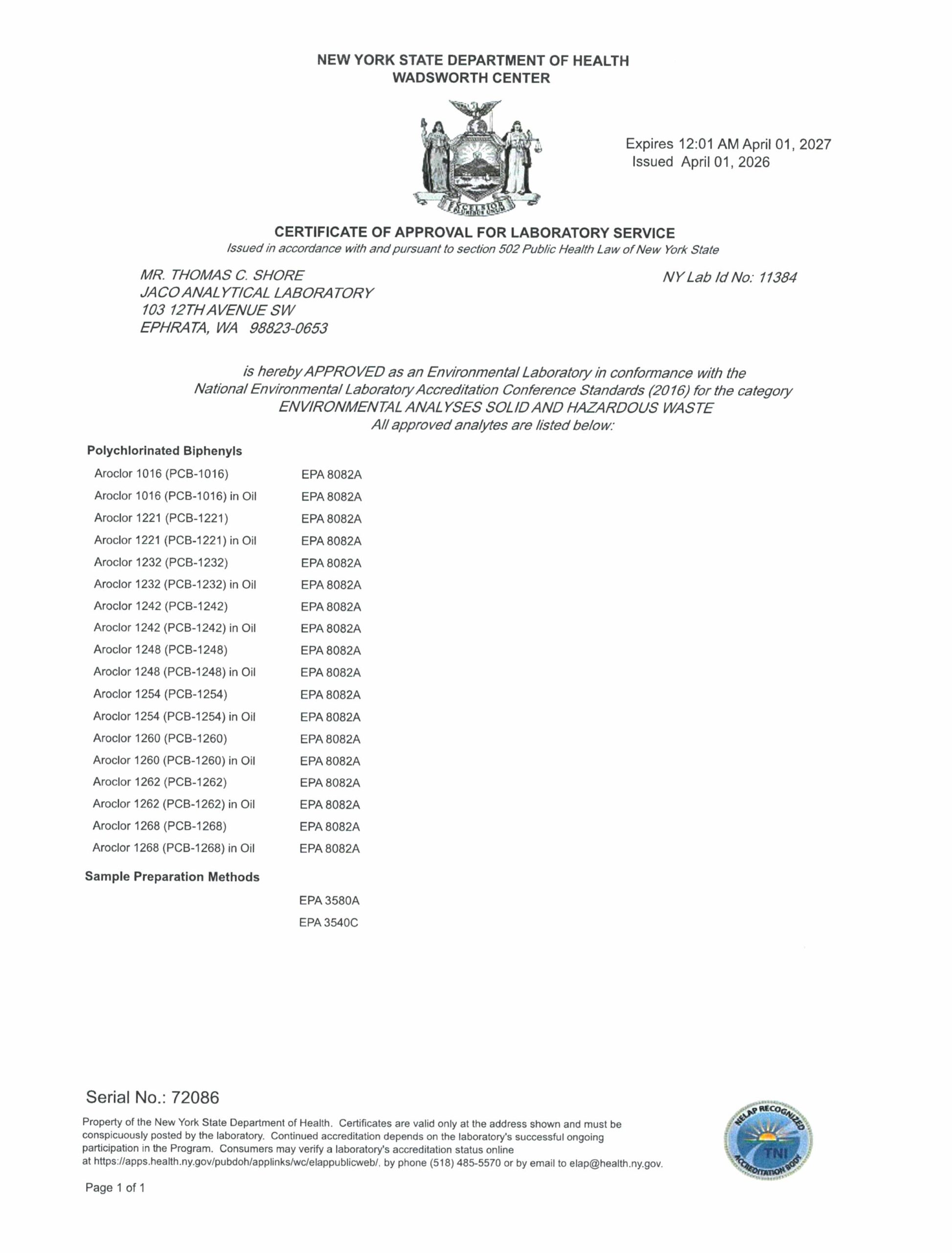 Washington PCB Certificate of Accreditation